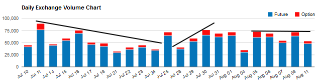 На графике внизу представлены дневные объемы торговли фьючерсами и опционами на Чикагской товарной бирже. Мы видим, что на последних торгах данной валютной пары, находящейся в боковом тренде, объем торгов в основном можно считать стабильным. Это указывает на то, что на данный момент быки и медведи имеют равную мощь. Вполне вероятно, что флэт может развиться в графическую модель «флаг», которая является моделью продолжения тренда в техническом анализе.